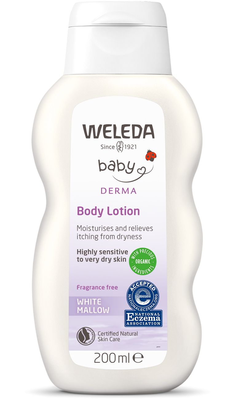 Weleda asked midwives to advise on the perfect moisturising lotion, and they helped us choose the most delicate formula we’ve ever made. Organic white mallow extract wraps baby in a cooling protective layer, kind-hearted pansy extract soothes irritation, and organic coconut and sesame oils nurture the skin. The fragrance free body lotion relieves itchiness and provides a pleasant cooling sensation on the skin. Thanks to carefully selected natural ingredients our White Mallow Body Lotion has a pleasant, mild scent without essential oils. For delicate skin that needs cosseting – especially in a family who already know sensitivity and allergy.